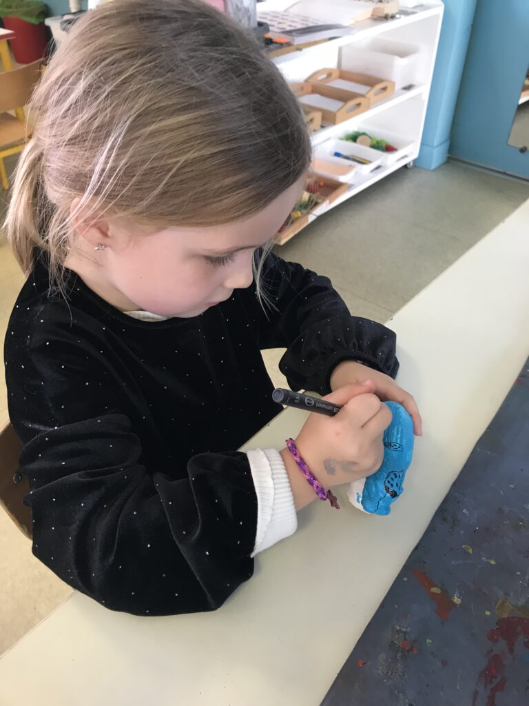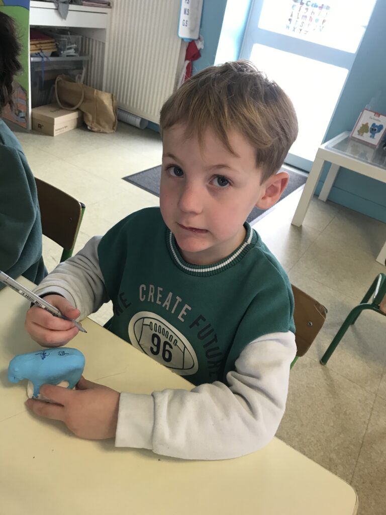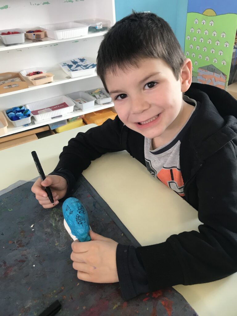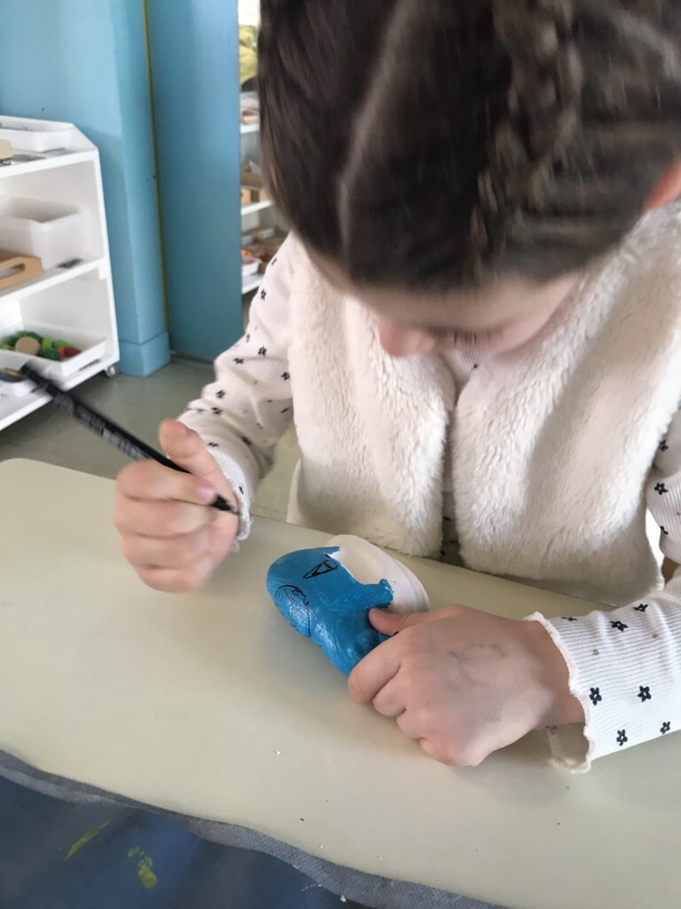 Nous avons donc nous aussi réalisé des petites statuettes, pour cela, nous sommes d’abord entrainés à reproduire les graphismes de plantes sur une feuille avant de les tracer sur le corps de notre statuette en plâtre préalablement peintes en bleu ! Le résultat est magnifique!!