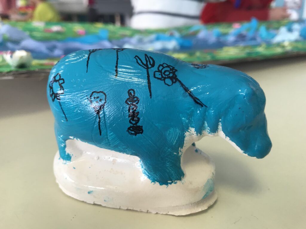 Nous avons découvert avec intérêt l’histoire de « Petit Noun, l’hippopotame bleu des bords du Nil » et nous avons eu la bonne surprise de l’accueillir en peluche) en classe !